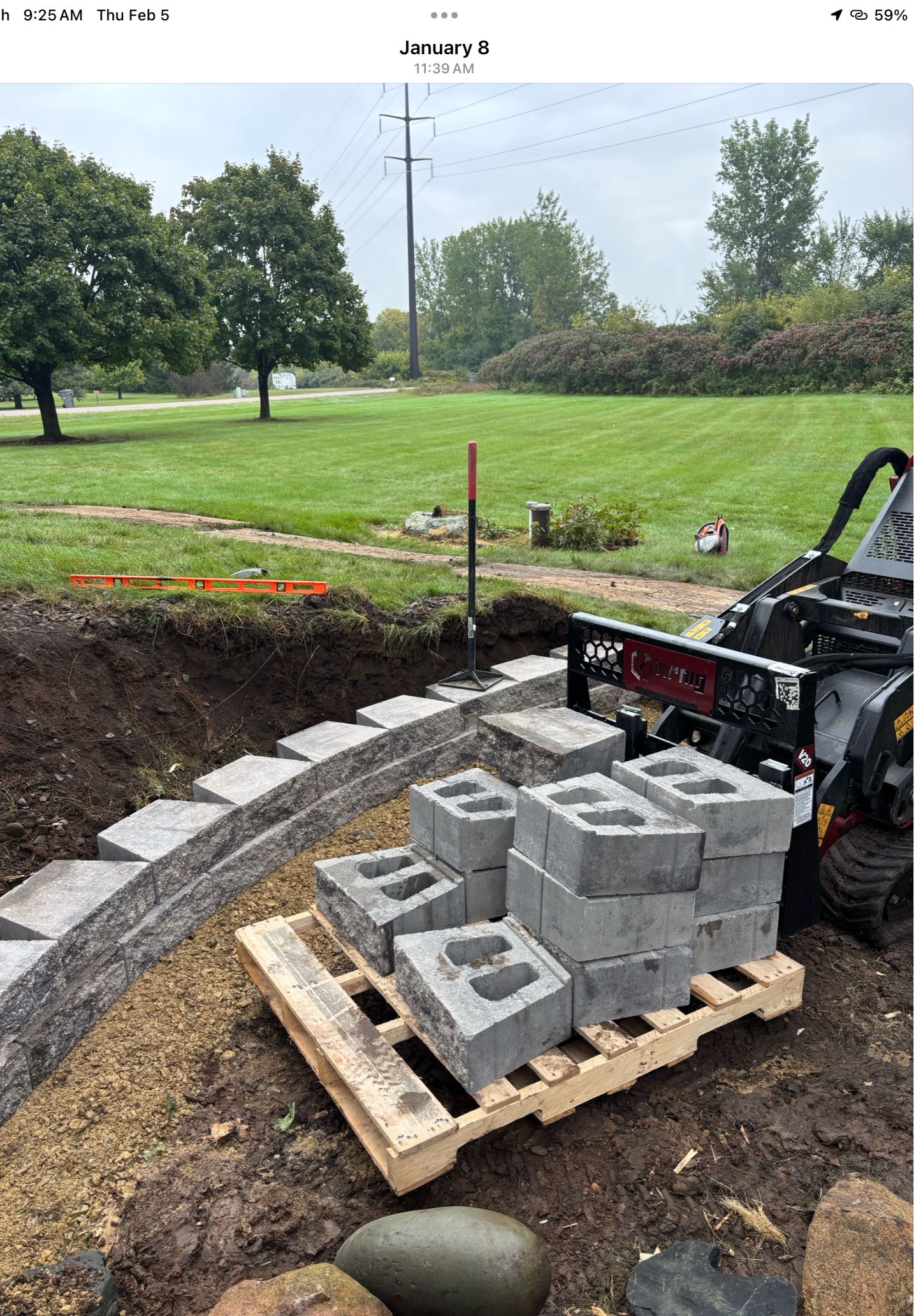 This project consisted of a full landscape reconstruction in Hudson, WI, requiring demolition, material removal, structural wall installation, and site redevelopment. Johnson Lawn Solutions began by excavating and removing approximately 35,000 pounds of existing river rock and unsuitable base material to expose a stable subgrade. The site was then regraded and compacted to establish proper drainage and load-bearing support for new hardscape features. We engineered and constructed two segmental retaining walls — one integrated with the patio perimeter and a second structural wall surrounding the egress door — each installed on a compacted aggregate base with proper setback, leveling, and drainage provisions to ensure long-term structural performance.